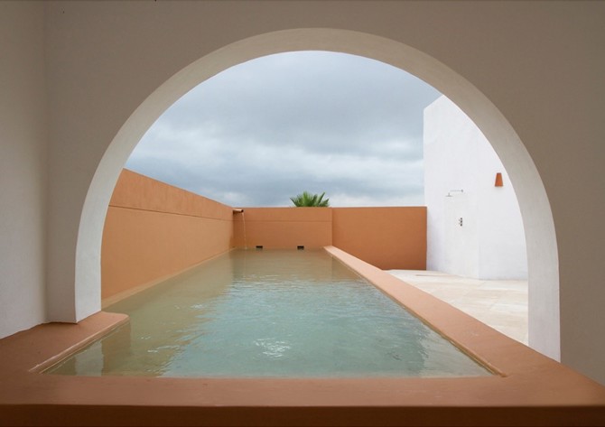 Tres. Reconvertir el corral a cielo abierto en un patio donde unos de los volúmenes se abre a este con una arquería, pudiendo recuperar la tradición de sacar la silla al fresco de la tarde tal y como hacen los demás familiares en el resto de las orientaciones sur. Introducir una alberca de las dimensiones de un carril de nado para dar frescos al patio y mantenerse en forma durante la vejez.