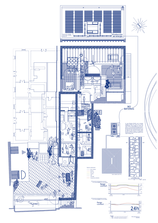 La vida en el cortijo se relocaliza en dos de las habitaciones que responden a situaciones diferentes de inverno y verano, como en la planta alta del pajar, donde estar resguardado del frio con chimenea y vistas; y la habitación a cielo abierto, donde se disfruta del sol desde la sombra y sin vistas a las detestadas estructuras de los invernadero. Ambos espacios articulados por la cocina.