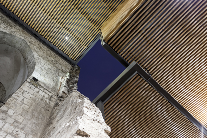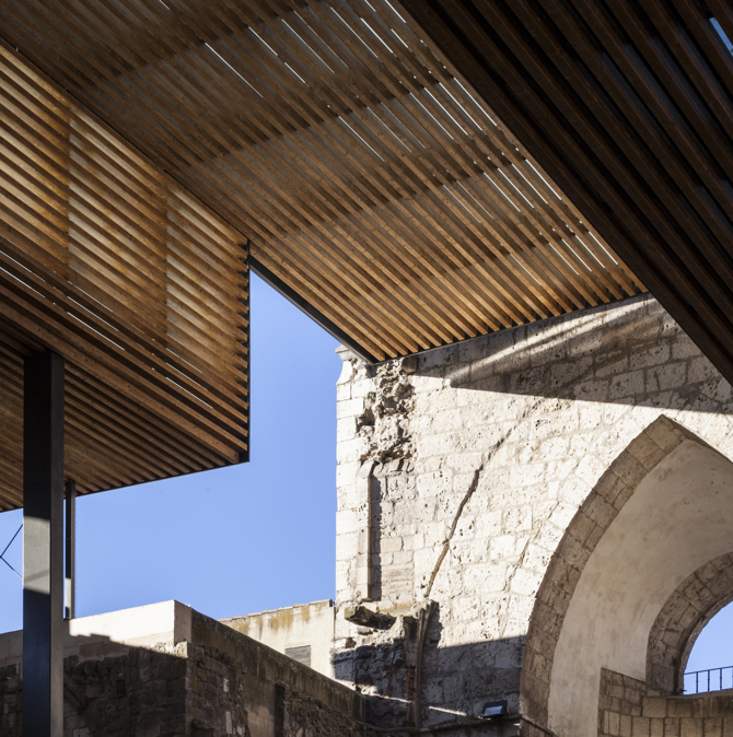 La nueva cubierta se materializa en un gran plano plegado que evoca y nos traslada desde su esencia a esa tipología eclesiástica de tres naves que originalmente existieron. A este plano plegado se le suman otros dos planos horizontales que cubren la zona del ábside y la zona noroeste. Todo este conjunto de planos, con una visión contemporánea y desde el respeto a los restos de la iglesia, pretende “flotar” por encima de la ruina como una estructura independiente dejando la percepción de los restos arquitectónicos inalterables.