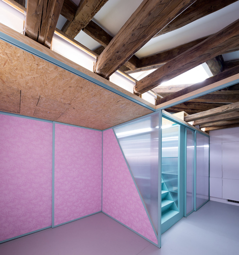 Por otro lado, en el suelo del bajo cubierta se ubican una serie de compuertas invisibles que pueden ser abiertas para cambiar la funcionalidad del espacio superior donde se encuentra la zona del dormitorio (de donde salen el tocador, el saloncito de té y el almacenamiento de la zona de baño). Unas y otras se encuentran integradas en el suelo y el techo y aparecen y desaparecen al antojo del usuario. En conjunto, las trampillas secretas y los paneles correderos complementan la configuración básica, según las necesidades del momento y permiten disponer diferentes combinaciones domésticas.