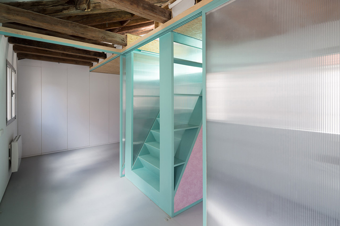 Por una parte, el núcleo central, que integra la escalera, unas estanterías y la despensa. El núcleo se ubica en el centro del espacio principal bajo la mansarda, lo que permite conectar la planta de acceso con el espacio bajo cubierta e introducir la luz natural que entra por la mansarda hasta la zona de estar. Por otra, dos bandas laterales, donde se concentra todo el programa funcional, como la cocina, el baño, el almacenamiento y los electrodomésticos.