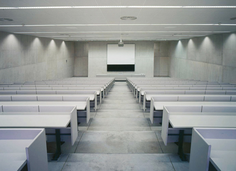 El ámbito de la convivencia es, sin duda, el protagonista del edificio, y se estructura verticalmente para que vuelquen sobre él todas las aulas teóricas de planta baja y las teóricas y prácticas de Periodismo de la primera.