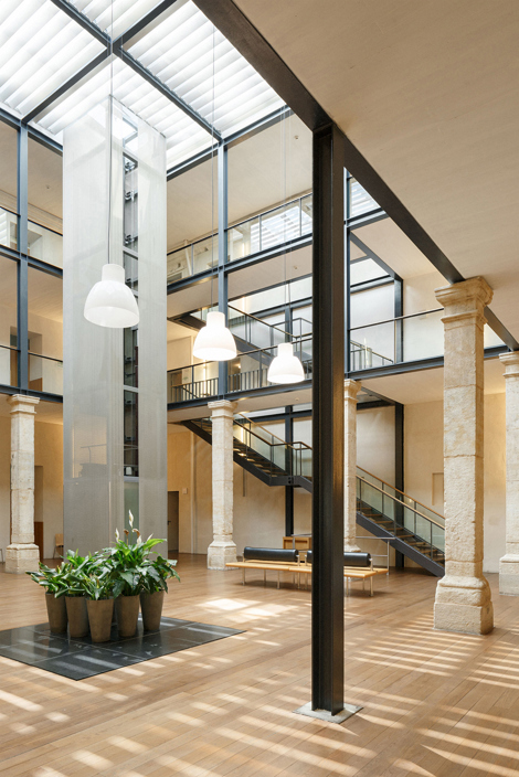 Pasado y presente conviven en este patio. Los volúmenes históricos se reparan; conservando las huellas de los distintos usos en su fábrica. La intervención contrasta en materialidad y dialoga en volumetría. Una torre de hormigón se eleva varios metros por encima de la cornisa del edificio nuevo, enlazando el edificio histórico con la intervención contemporánea y generando una conversación con la Torre del Clavero, en la Plaza Colón.