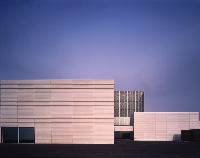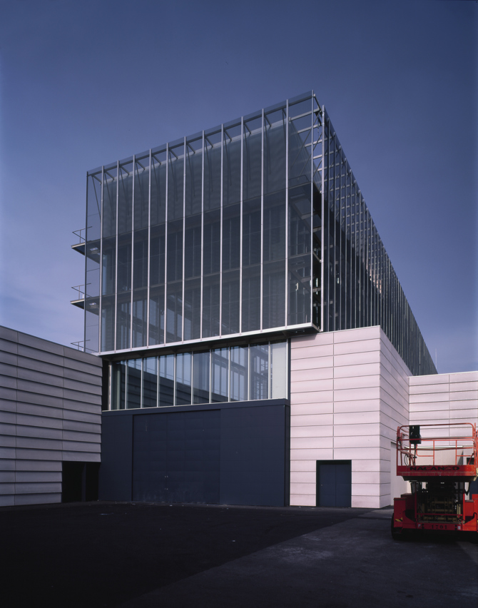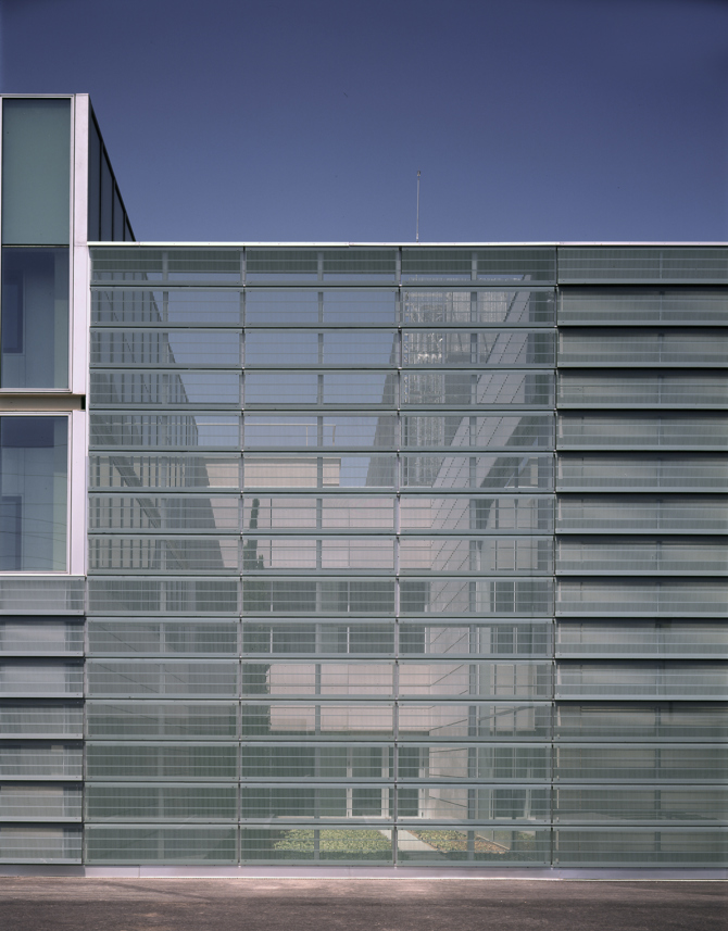 Para la construcción de este extenso zócalo, mayoritariamente sin requerimientos de luz natural, se ha empleado un sistema de fachada ventilada formada por piezas de naturvex o vidrio serigrafiado (de 60 x 2,40 m). Tanto unas como otras pueden ser colocadas de forma vertical o inclinada, de manera que los grandes paños de fachada se descomponen en zonas menores donde la colocación es homogénea. Esta decisión de extender una piel uniforme pero diferenciada permite que las construcciones existentes queden unificadas con el nuevo edificio.