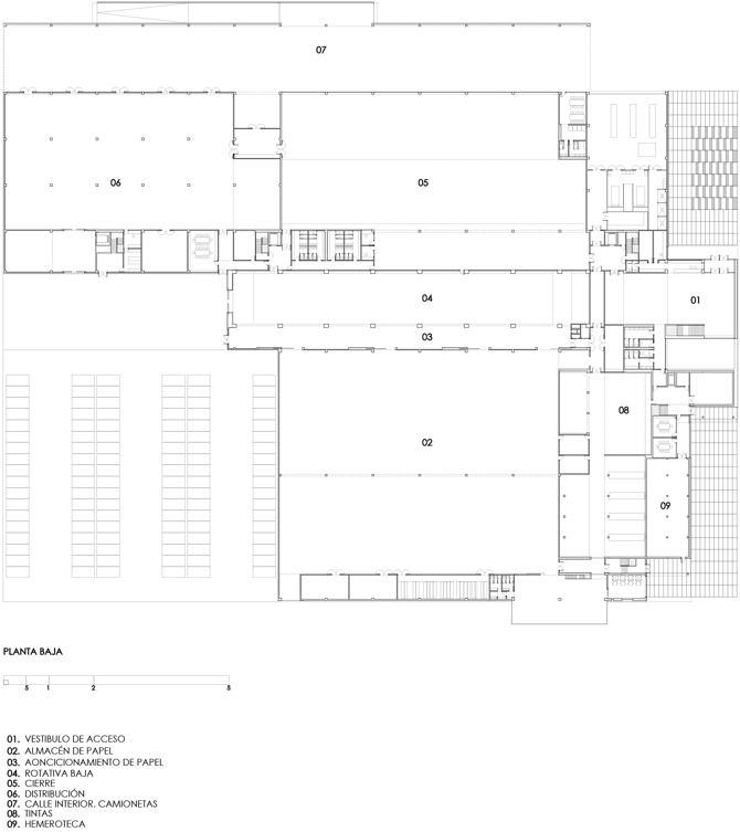 En el proyecto para la nueva sede de la rotativa del Heraldo hubo que trabajar desde el principio con dos cuestiones dadas: la existencia de una nave y unas oficinas que había que conservar y las propias características técnicas de la maquinaria que debía alojar.