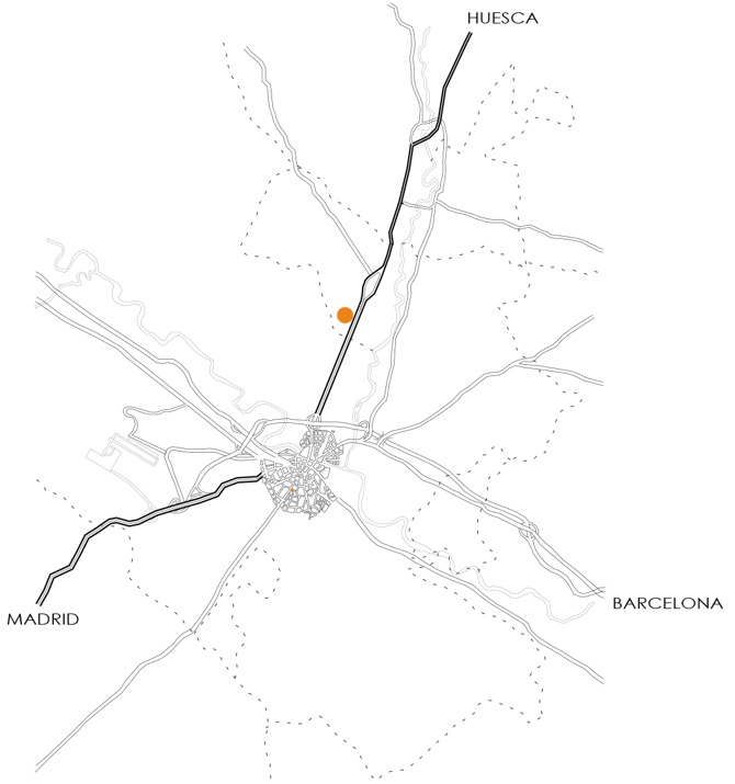 La situación del solar respecto a la autovía Zaragoza-Huesca propiciaba que el edificio pudiera convertirse en un punto de atención para los usuarios de este acceso a la ciudad: su visibilidad desde un vehículo en movimiento invitaba a explorar las posibilidades del edificio como icono publicitario, al mismo tiempo que como objeto en el paisaje.