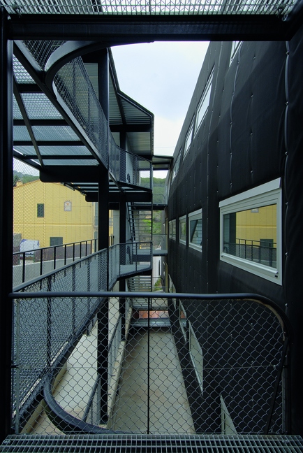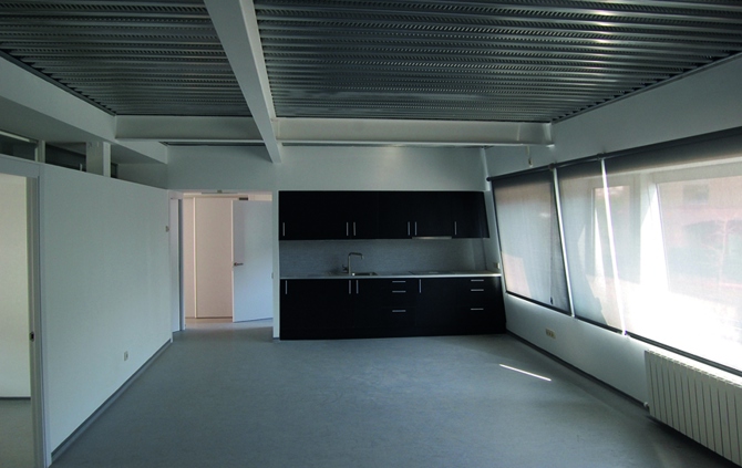 Las pasarelas exteriores son un espacio de uso semiprivado conectado con un pequeño jardín anexo a las pequeñas edificaciones existentes que coronan la pendiente. Las salas de 42m2 convierten a las viviendas en pequeños lofts con vistas.