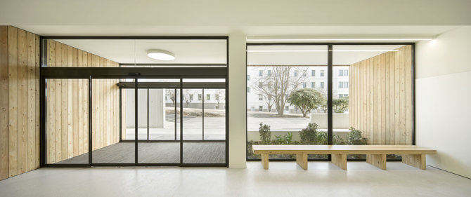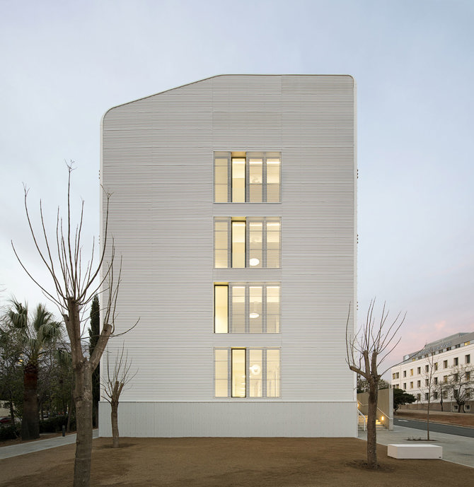 Integrado en el entorno: el edificio se integra en el contexto urbano a escala ciudad. La volumetría, la ubicación y el color blanco de las fachadas se asimilan a las del resto de edificios existentes en el Parc Sanitari. En planta baja el edificio genera un patio de acceso. Un espacio de transición que permite tener diferentes accesos separados necesarios para diferenciar los circuitos y generar una zona de espera no-COVID al aire libre.