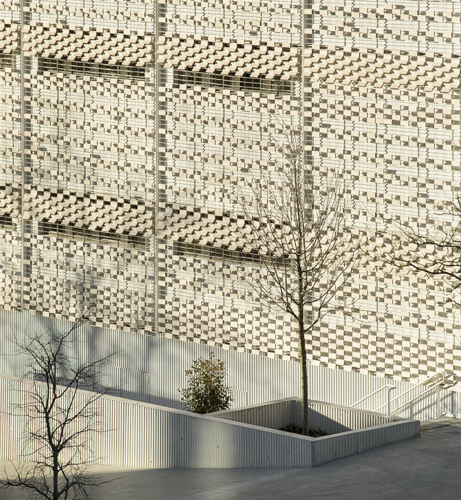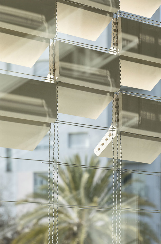 La ventana paramétrica: ventana corrida y modular con montantes verticales cada metro que permite recibir tabiques de forma modular, facilitando el cambio de distribución sin afectar la fachada. Además, esta ventana se repite en todas las fachadas y favorece así mucho el proceso de fabricación y montaje.