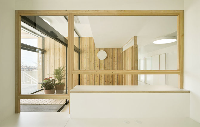 Construcción off-site: el proyecto y la obra se han realizado en 20 semanas con un sistema industrializado diseñado para una vida útil de más de 40 años. La construcción off-site de los módulos de estructura y las fachadas ha permitido reducir términos. La gestión de todo el proceso ha seguido la metodología “Lean construction”, con un seguimiento de la planificación y las restricciones para gestionar la obra a tiempo real. La participación semanal de todos los agentes de la obra ha sido fundamental para controlar el proceso y ajustarse a los términos.