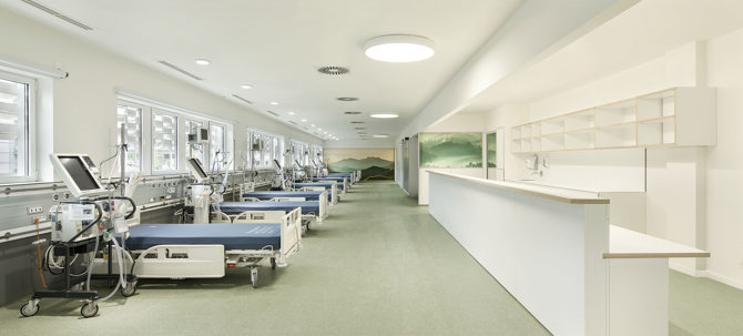 Los materiales de revestimiento interiores, con el uso de la madera y de diferentes imágenes de naturaleza, ayudan a alejar el espacio interior del imaginario hospitalario aséptico. La iluminación está programada con diferentes escenas, no solo separando día y noche, sino pensando en el confort del usuario, haciendo una gradación entre espacios de paso y los espacios de atención sanitaria. Se huye de una iluminación excesiva y homogénea que no reconoce las diferentes intensidades y concentraciones según necesidades de uso. Los espacios de instalaciones se sitúan siempre en la zona limpia, de manera que la mayor parte del mantenimiento se puede hacer con seguridad para las personas que trabajan en ello.