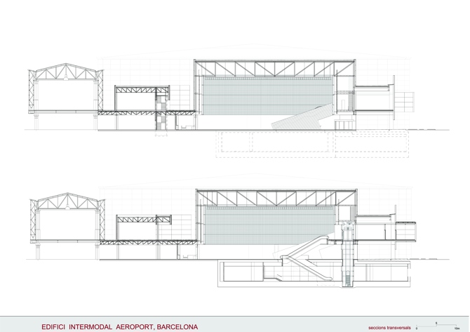 El edificio intermodal y de conexión con las Terminales A y B se caracteriza exteriormente por una fachada que se extiende más allá de la propia dimensión del edificio, ya que se intenta establecer una continuidad entre las fachadas de la Terminal B, desde el mural de Miró y la Terminal A.