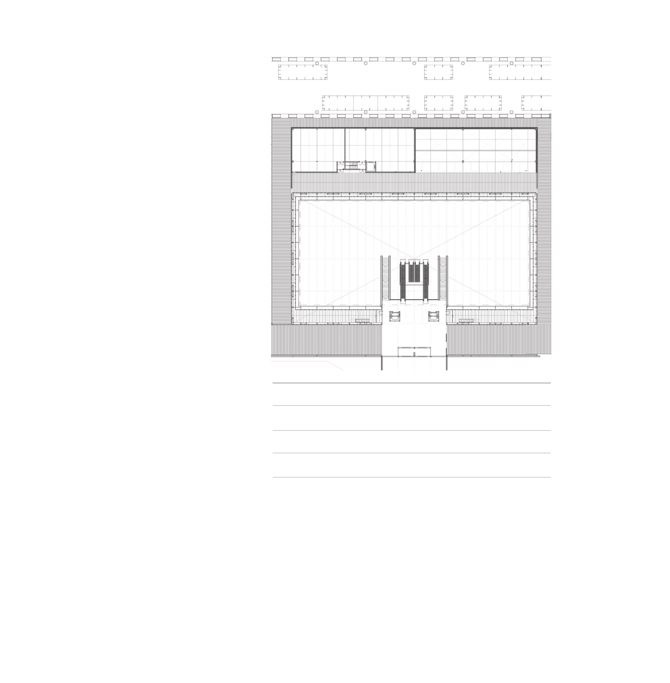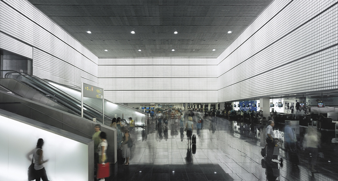 El espacio intermedio se utiliza como galería de servicios. El gran espacio interior que articula los flujos y circulaciones de pasajeros ofrece un ambiente nítido y relajado. Un gran volumen rodeado de un muro perimetral de vidrio translúcido iluminado, le otorga una condición de espacio flotante y perpetuamente vacío, aunque se encuentre lleno de personas.
