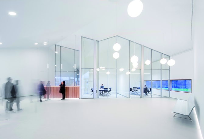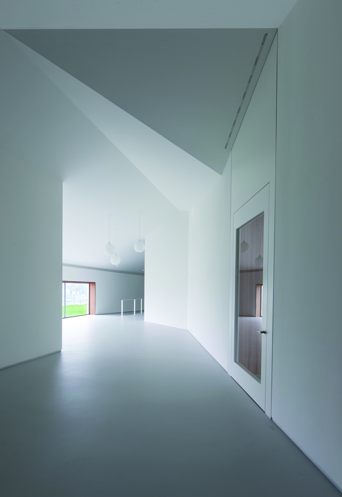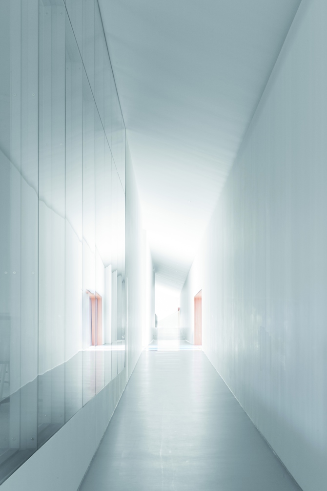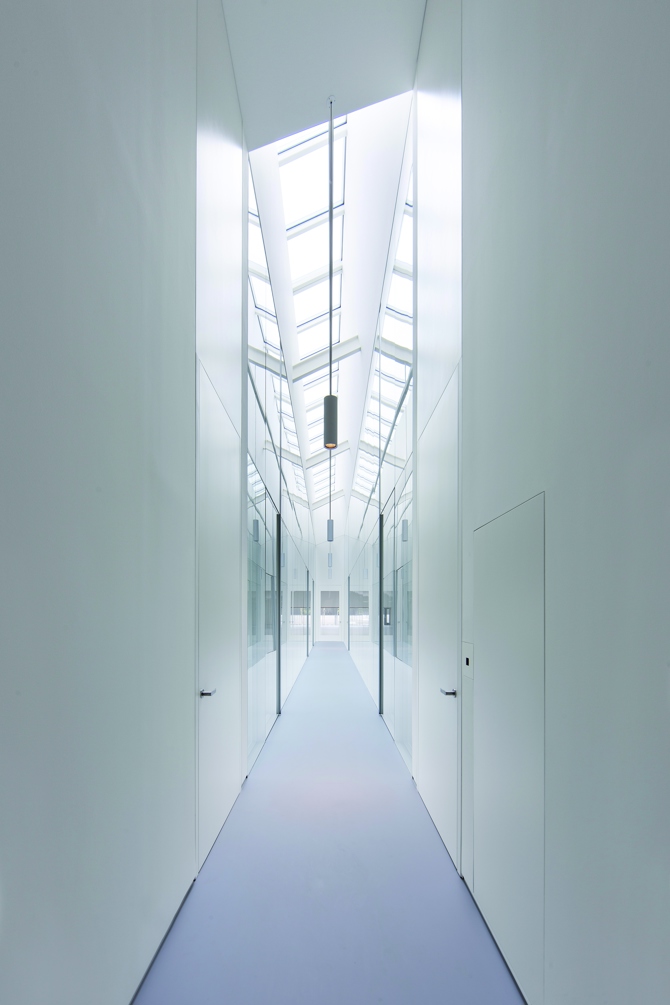 El interior procura el equilibrio entre la sencillez y la sorpresa. La organización de los cuerpos en planta, que no es ortogonal, genera a su vez ricas geometrías interiores especialmente en los puntos de encuentro, geometrías que cualifican sin duda los espacios. La luz es importante. Siempre proponemos divisiones de vidrio con el objeto de que la luz se traslade al interior o, allí donde sea necesario, se recurre a lucernarios que provean de luz a este interior. El edificio es autónomo energéticamente y no está conectado a la red.