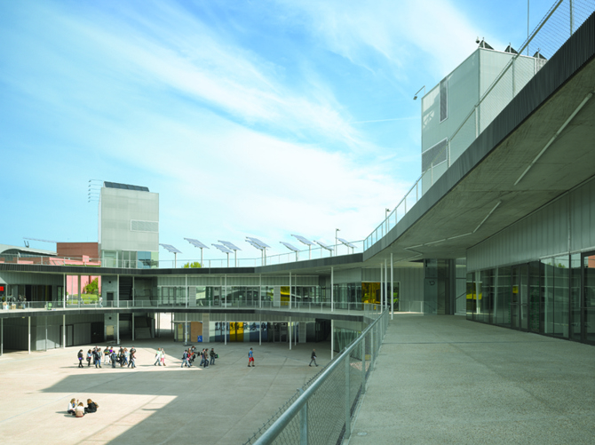 Y estos se extienden a la cubierta, que equipada, se convierte ya en gran mirador desde su posición dominante a más de 12 m de altura sobre la calle, abarcando la panorámica de la sierra madrileña. Las circulaciones se construyen alrededor del gran vacío de la Plaza Mayor con la prolongación de las plataformas que como grandes soportales con sus pliegues facilitan la continuidad entre todos los niveles.
