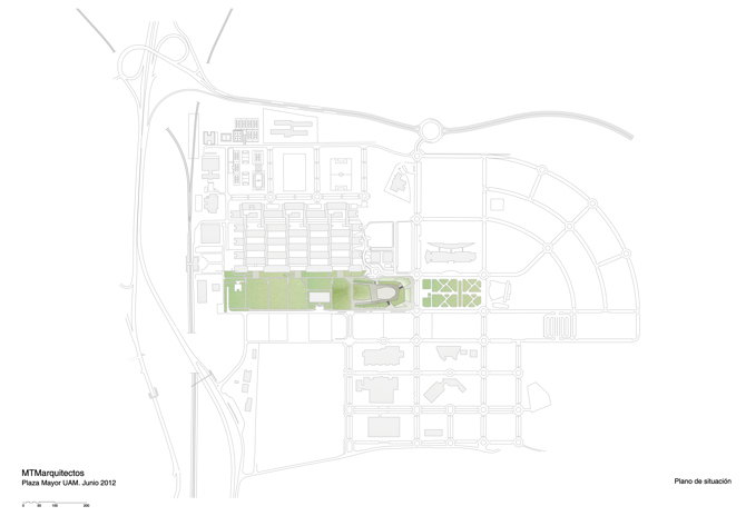 La Universidad Autónoma de Madrid (UAM), en su Campus de Cantoblanco, ha crecido alrededor del gran bulevar verde, que como eje vertebrador de su desarrollo urbano es el lugar de concentración de circulaciones y encuentros del campus. Desde la estación de cercanías, que supone el gran acceso público desde Madrid, el eje se desarrolla en orientación este-oeste. El nuevo foro público de la universidad, la Plaza Mayor, se situará en el extremo más alejado del bulevar, prolongándolo ya como parte de una nueva infraestructura-paisaje.