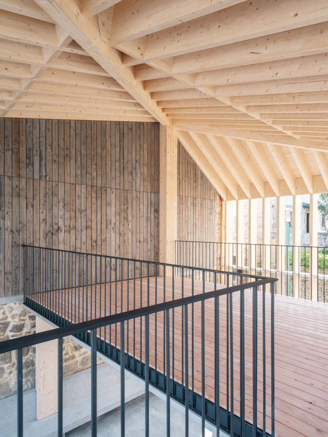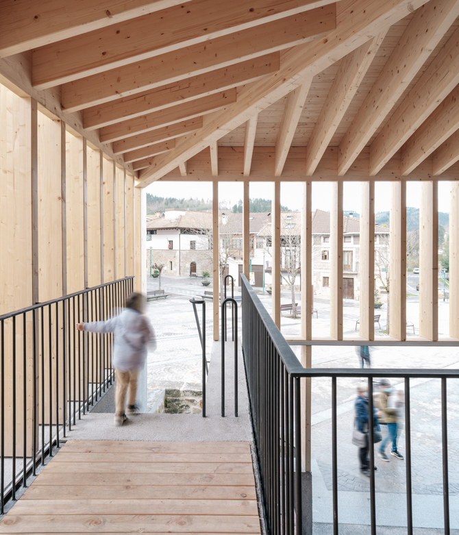 La estructura de la cubrición exterior que conforma el espacio, de madera laminada, está formada por una serie de costillas o nervios estructurales que sirven de envolvente abierta y ventilada y sostienen una cubierta inclinada a tres aguas. La estructura se complementa con un único gran pilar de madera adosado al edificio del ayuntamiento que sirve para sostener tanto la cubierta, como una entreplanta de forjado madera contralaminada, esto último mediante un pequeño pórtico en un extremo y una gran viga de hormigón en voladizo en el otro.