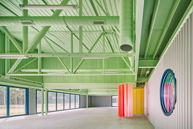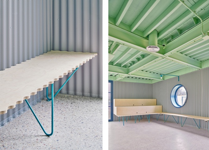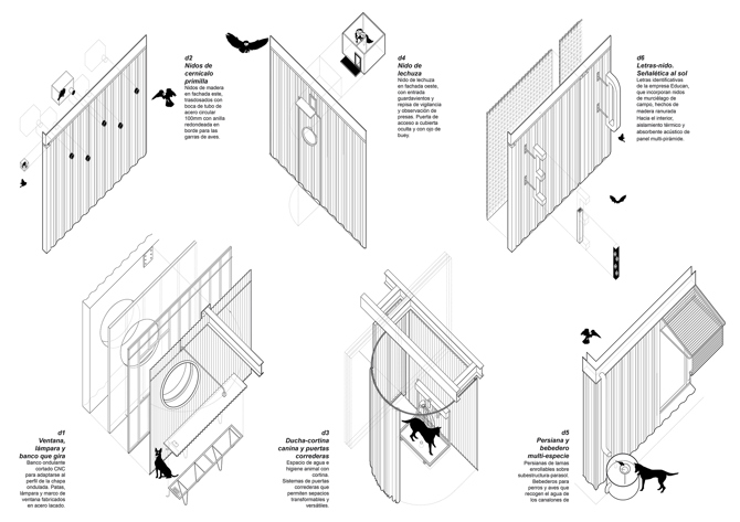 Materias diversas se encuentran en este edificio, combinando diferentes técnicas constructivas, oficios y sistemas de producción: de la ecología material y la reducción de residuos en la reutilización de contenedores marítimos, a la adaptabilidad e inercia térmica del hormigón in situ –suave y ondulante encofrado con las propias chapas recuperadas de los recortes hechos para las nuevas cerchas–; de la estandarización y optimización de los paneles industriales de chapa metálica a la precisión de las juntas de madera laminada cortada en CNC; de la estandarización industrial de ingredientes básicos como los contenedores 40'HC al trabajo de cerrajería artesanal que permite customizar encuentros, ensamblajes o nuevos elementos como patas de banco, lámparas o grandes correderas que abren y cierran espacios; de los sistemas de climatización por aire automatizados, a los elementos de control bioclimático manual como las contraventanas perforadas o las persianas enrollables; del peso material de cimentación y muro de hormigón a la ligereza del resto de elementos ensamblados en seco.