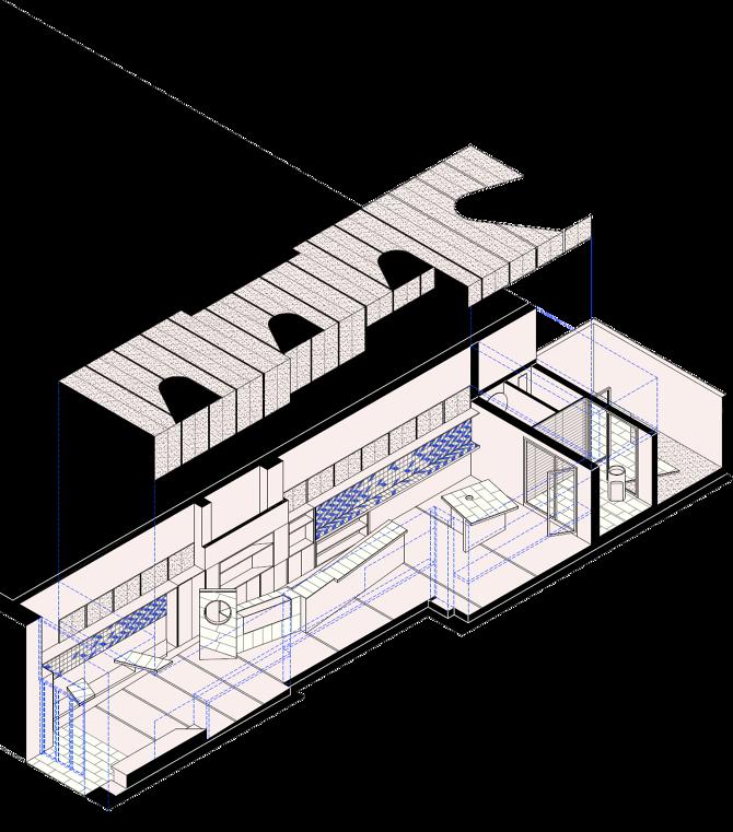 Completados estos criterios esenciales, la estrategia proyectual diferencia dos sectores, dentro de un único espacio. En primer lugar, se proyecta el envoltorio perimetral, formado por los revestimientos de corcho y baldosa, y pavimento y muros con un revestimiento continuo. En segundo lugar, se construye una serie de objetos de obra, con sobras revestidos de loseta de mármol, esparcidos por el local. Con sus geometrías, asearán los usos:
