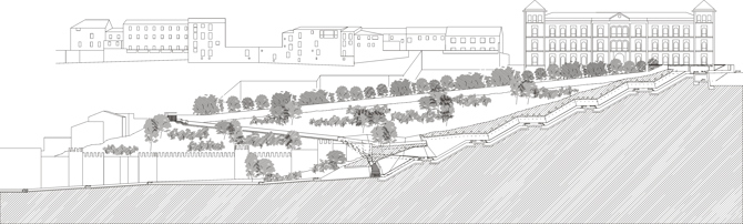 En el caso de la bajada de La Granja se han instalado escaleras mecánicas que inician su recorrido después de cruzar un corto paso cubierto bajo la cimentación de la muralla medieval. Este paso es una nueva puerta a la ciudad alternativa a las árabes de La Bisagra y El Cambrón. Para que el paisaje de la cara norte de la ciudad sufriera el menor impacto ambiental posible, la construcción que alberga las escaleras se ha incrustado en la ladera. Los seis tramos de escaleras necesarios para salvar el desnivel de 40 metros forman una figura en zigzag que permite, por un lado, adaptarse a la topografía y, por otro, evitar la sensación de vértigo que podría ocasionar a un usuario ver todas las escaleras de una vez, si estas se hubieran dispuesto en una línea continua.