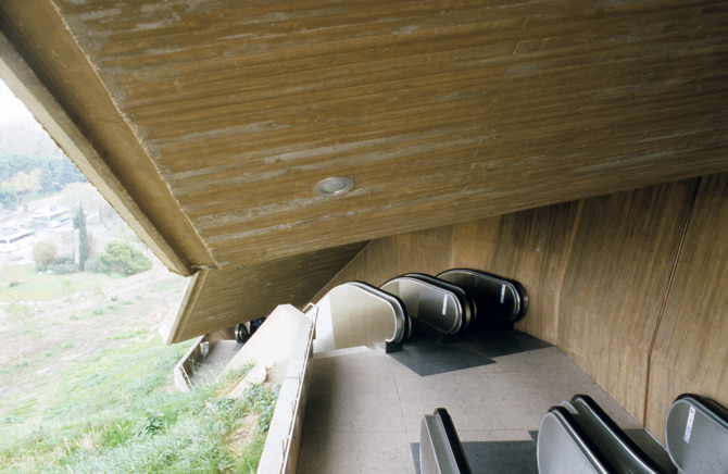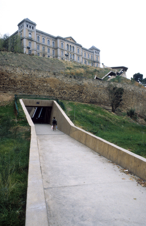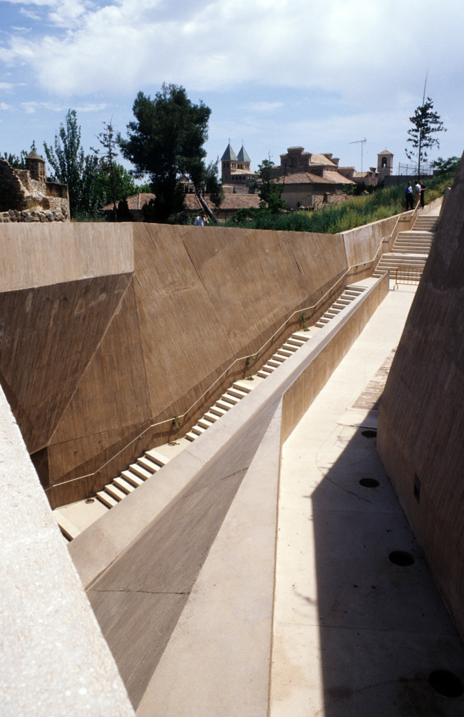 Las escaleras mecánicas se apoyan sobre una cimentación de hormigón a 30 metros de profundidad y están acompañadas en una de sus caras por un muro de contención de tierras, que a su vez soporta una cubierta en voladizo de 6 metros inclinado que las protege y permite dar continuidad a la pendiente ajardinada de la ladera. Este techo no sigue exactamente la inclinación natural de las tierras, se levanta ligeramente para hacer aparece una larga y continua abertura que acompaña el recorrido de las escaleras, desde la que se divisa la vega del Tajo y el nuevo Toledo. (El hormigón con el que se ha construido la estructura de soporte de las escaleras es del color del ladrillo y el mazapán toledanos).