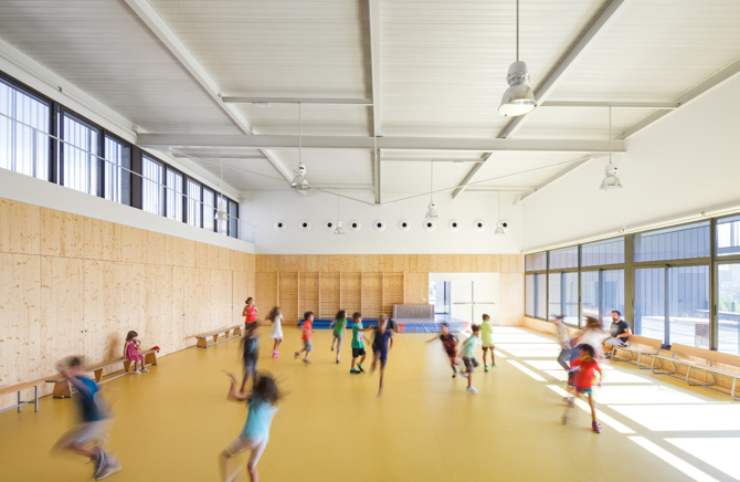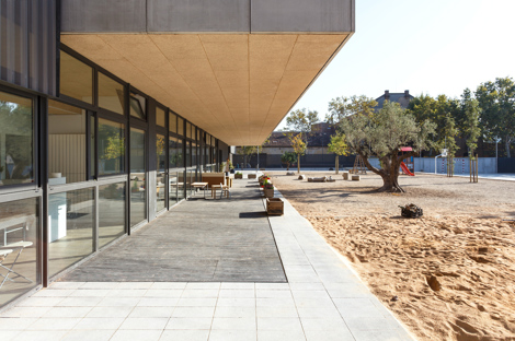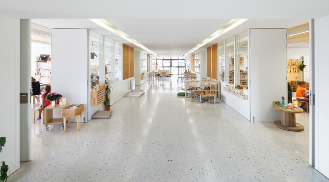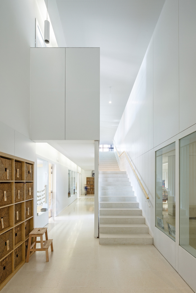 La escuela ha organizado para plantas agrupadas dos a dos. A la baja y primera la parte pública del programa y el aulario infantil. En la segunda y tercera las aulas de primaria situadas a ambos lados se relacionan a través de un hueco central donde se genera actividad docente más allá de las clases. Se han proyectado espacios abiertos para estimular la movilidad de los alumnos por los diferentes ambientes de aprendizaje.