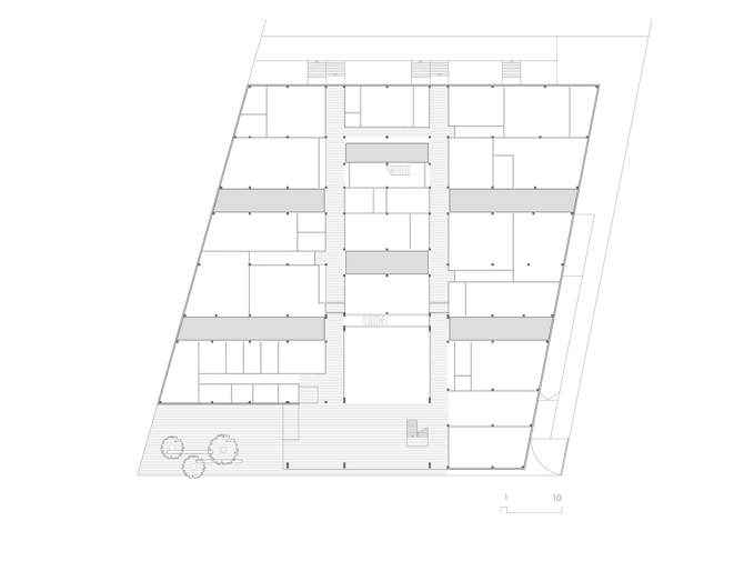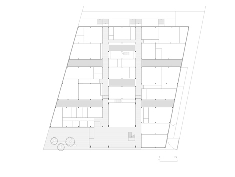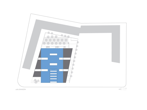 El edificio se organiza en dos piezas superpuestas, la planta baja sigue la geometría de la parcela, mientras que el volumen superior se singulariza mediante el color azul y la geometría ortogonal, convirtiéndose en una pieza singular. El conjunto se dibuja sobre una trama modular, alternando espacios docentes y patios, articulados en un esquema de circulación en anillo que permite una óptima relación entre espacios.