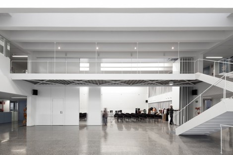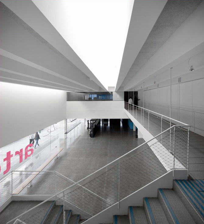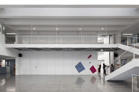 Al entrar se percibe una gran amplitud visual, el vestíbulo se duplica eventualmente con el salón de actos mediante una pared móvil, y una doble altura genera una relación fluida entre plantas. Los distintos talleres dejan ver la actividad que en ellos se realiza mediante mamparas acristaladas, de tal manera que los alumnos conozcan lo que sucede en todos ellos, y no solo en su especialidad. Como en el taller de un artista, se advierte una atmósfera especial. Todo el edificio está impregnado del carácter propio de los espacios de creación. La escuela será lo que su “comunidad” de usuarios quiera que sea. Es un papel “en blanco”, abierto a la creatividad de los alumnos y profesores.