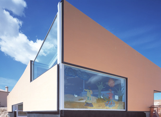 La guardería se sitúa en uno de esos paquetes-isla que organizan la manzana de equipamientos y, a través de una fuerte manipulación topográfica, se consigue redibujar y redefinir el emplazamiento de la escuela infantil.