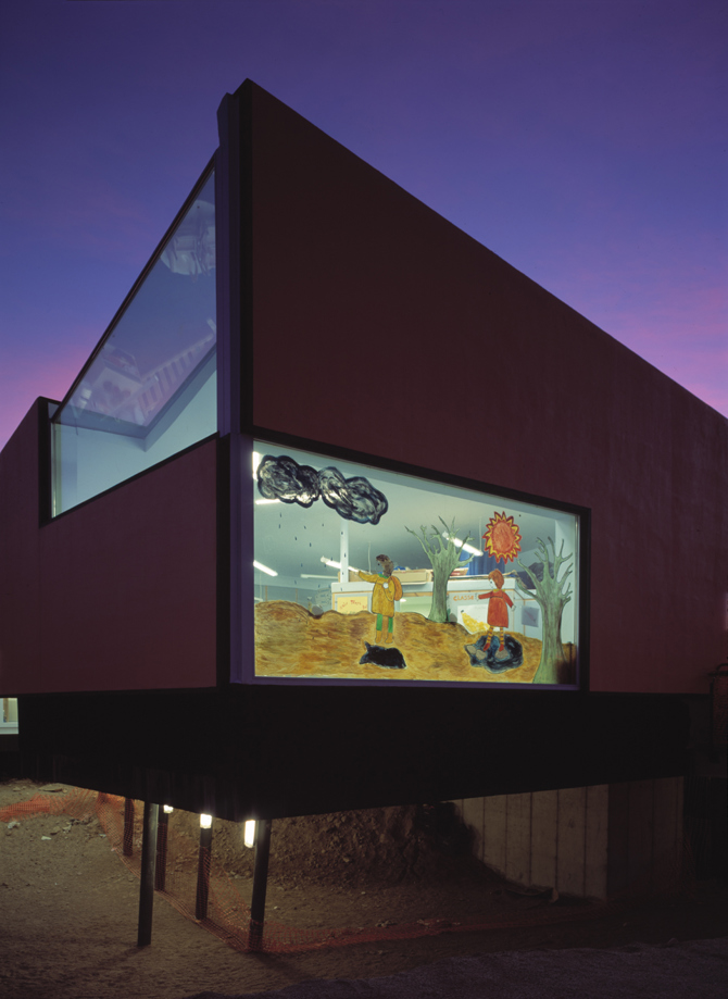 La colocación de la guardería sobre un gran hoyo excavado en el solar facilita a la escuela establecer una doble relación con el entorno que le rodea. Por un lado, situar el edificio por debajo de la cota del terreno perimetral provoca la sensación de aislamiento respecto del entorno residencial pintoresco-vacacional vecino. Y por otro lado, la fuerte manipulación topográfica permite también establecer una nueva relación formal y espacial con los equipamientos que se situaran en el hoyo mas cercano: las piscinas.