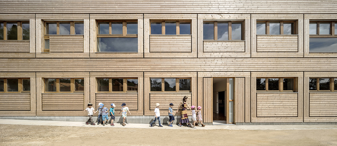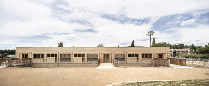 La Escuela El Til·ler se instala en un antiguo jardín privado abandonado, en la urbanización de Bellaterra. El conjunto se articula a lo largo del camino principal existente, que se convierte en una rambla que desemboca en una plaza abierta al paisaje del valle del Vallès y la Sierra de Collserola. Cinco de los seis edificios que conforman la escuela son pabellones modulares de madera y acero que provienen de otros dos solares ocupados anteriormente por la escuela. Estos edificios se desmontan, transportan y reconfiguran cuidadosamente en el nuevo emplazamiento, sobre tres terrazas limitadas por taludes verdes que se adaptan a la topografía y la vegetación existente. El conjunto se completa con el nuevo edificio de educación infantil y espacios comunes, que se presenta aquí.