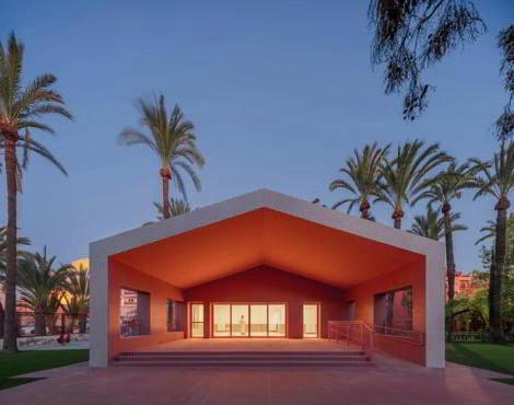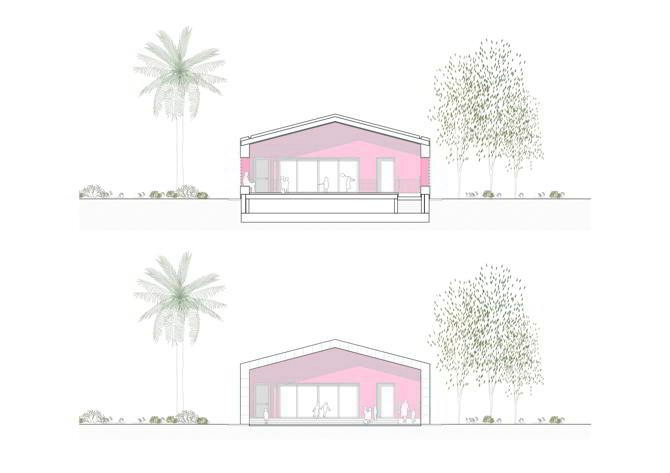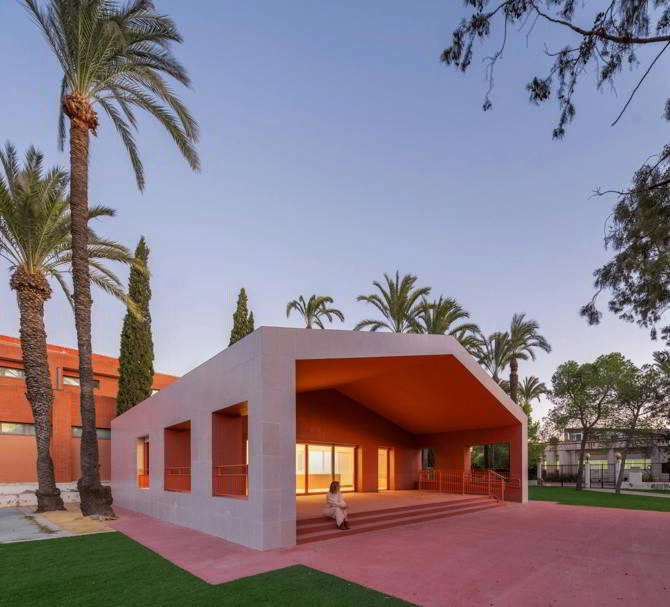 Como área de transición entre el exterior y el interior, se proyecta un porche que prolonga y cualifica este espacio exterior mediante la extrusión de la geometría de la nave. Este porche se define por un marcado contraste de color en su interior en comparación con la fachada exterior. De este modo, se concibe como un espacio singular, como una concha interior rosa que lo diferencia y cualifica con respecto al resto de las edificaciones y arbolado.