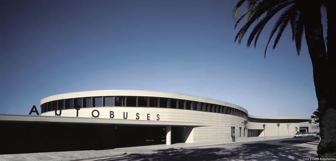 La forma del edificio deriva directamente de las circulaciones y los flujos que debe acoger generándose así la figura de la planta que resuelve un programa complejo y variado. Alrededor del hall, en planta baja, están situados todos los servicios de atención al viajero, mientras en la planta alta se ubican las oficinas de las compañías de transporte y la zona de vestuarios y descanso de personal. El hall de viajeros mantiene una continuidad formal con la zona de andenes, en torno a la cual giran los autobuses, evitando el cruce con las circulaciones peatonales. El desarrollo de las dársenas alrededor de un gran patio circular permite la yuxtaposición entre el jardín y los autobuses, entendiendo esta proximidad como uno de los mayores atractivos del proyecto. Sobre una planta tal, se ha intentado, sin embargo, restablecer la unidad del conjunto. De ello se encarga un gran techo plano y continuo de 7 metros de altura, que unifica hall y dársenas, evitando el carácter habitualmente dual de estos edificios.