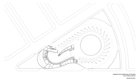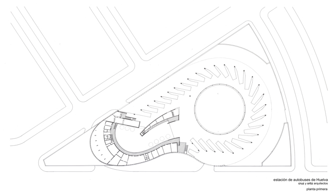 Sobre una parcela con forma de sector circular de 55° y una longitud de radio de 200 metros se sitúa la nueva Estación de autobuses de Huelva.