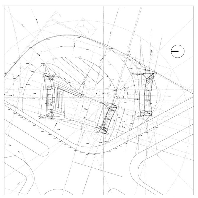 El viajero llega a la estación desde el centro del pueblo, atravesando bajo las bóvedas que soportan las viviendas y que cubren las calles transversales. Una situación análoga se produce al pasar bajo la lámina pequeña en el acceso a la estación. Esta lámina recibe al viajero y lo arropa al convertirse en suelo, que a la vez es el techo ingrávido del sótano. La zona de viajeros, con su pequeña inclinación, nos introduce dentro de la idea de movimiento de todo el conjunto. El sótano concentra gran parte del programa, liberando de servidumbres la planta de acceso y favoreciendo una percepción completa de la cinta. La lámina se pliega y se gira para adecuarse al espacio, a la escala de los autobuses, a su carácter público.