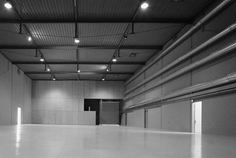 La construcción, materiales, estructura e instalaciones de este espacio se ponen al servicio de la actividad principal reforzando la neutralidad del proyecto. El edificio se construye con técnica y precio de nave industrial: estructura de acero vista con protección contraincendios, forjados deck colaborantes, muros de bloque de hormigón, suelos de hormigón pulido, instalaciones vistas, fachada de tableros de cemento-madera.