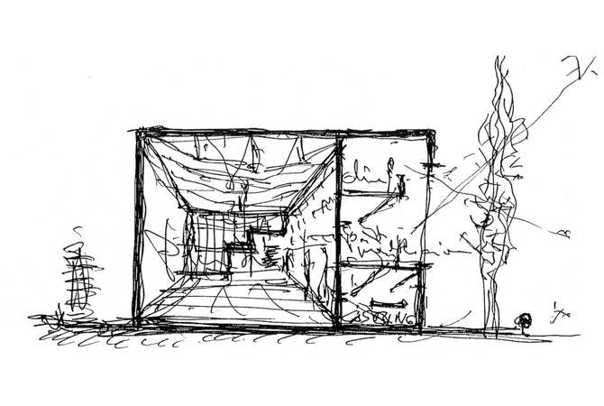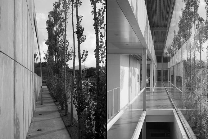 El proyecto incorpora, como elemento externo, una plantación lineal de populus teixana a poca distancia de la fachada principal. Esta formación vegetal nos revela un nuevo espacio intersticial negativo del interior. Este espacio relaciona la actividad interna con el espacio exterior, al tiempo que utiliza su condición cambiante. En verano un espeso colchón verde protege del sol, en otoño cambia de color y purga sus hojas, en invierno se convierte en un reflejo sobre la gran ventana acristalada y en primavera va mostrando sus diferentes coloridos.