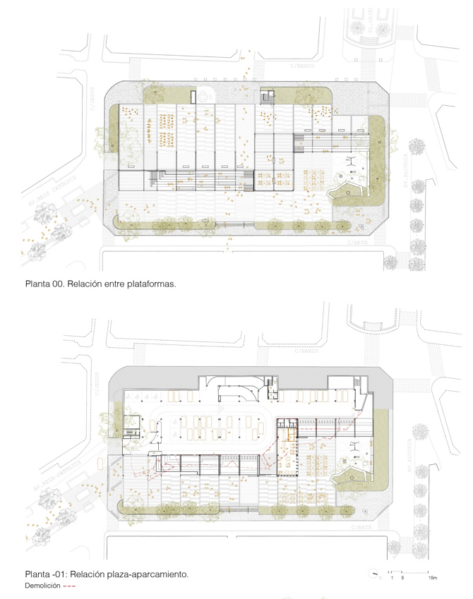 El proyecto actúa en la intersección entre niveles, no solo para mejorar la integración de los distintos espacios de la plaza y su entorno, sino para sembrar, nutrir y articular nuevas posibilidades para el futuro de este espacio público. Ahí donde el muro dividía, ahora hay una nueva topografía artificial para relacionarse (grada). Ahí donde la gente cruzaba a oscuras de noche o bajo el sol en verano, ahora hay sombra, vegetación e iluminación de noche para pasear (pérgola). Ahí donde no había actividad, ahora hay un nuevo espacio que da vida a la plaza (local).