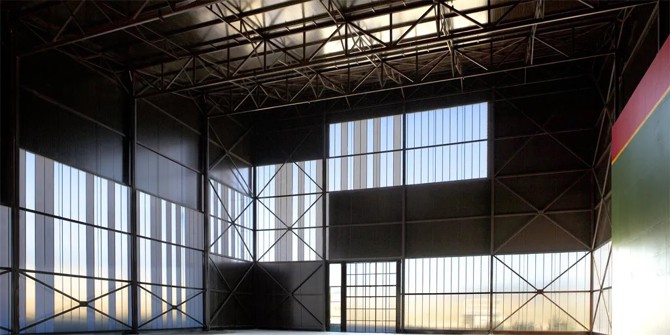 Un contenedor sobre el suelo que disminuye en altura hacia la villa y se abre a la luz del sur. Una gran grieta de luz natural que hace sentir al usuario aún más la inmensidad del espacio.