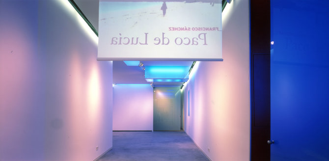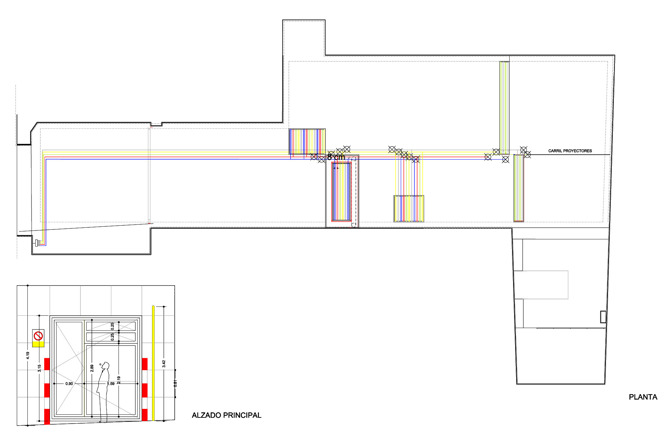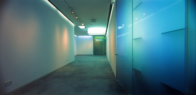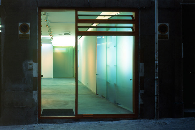 La galería ocupa el bajo de un edificio existente de viviendas que invaden el espacio de exposición con codos de bajantes que cuelgan del forjado. La galería se ilumina desde cajas de luz colgadas que ocultan la visión de estas bajantes.