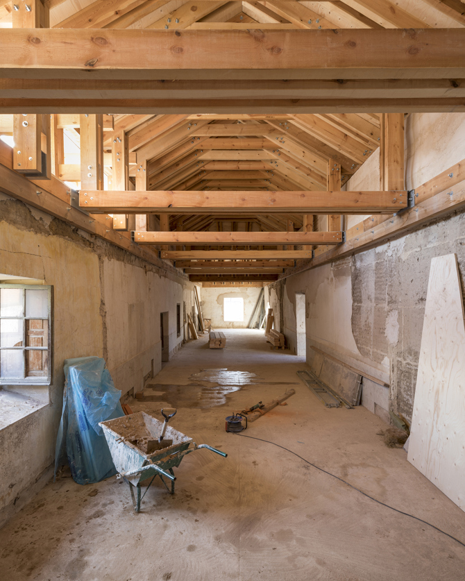 El restauro, por analogía, repite el modelo de carpinteros y albañiles locales inexpertos en restauración pero doctos en los mismos métodos constructivos que alumbraron al hospital hace 500 años, respetando también la misma economía circular original. La obra es construida con morteros de cal y arena y un tablón de construcción sin labrar de 21x7 cm, que aparejado de diferentes formas construye alfarjes, cubiertas, artesas, apeos y escalera. Hoy el hospital está de nuevo en pie, alzado bajo las huellas de su memoria, para continuar el curso de la vida.