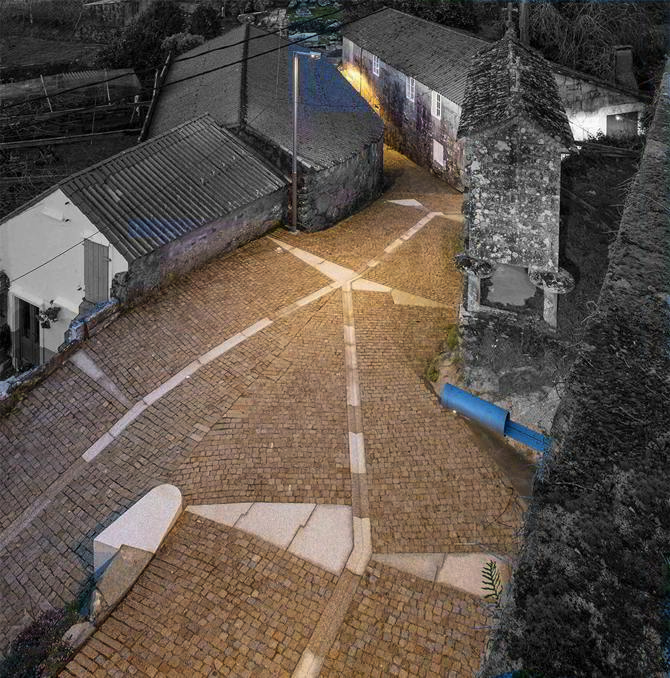 Esta estrategia de humanización de los rueiros de Nebra, en Porto do Son, A Coruña, trabaja sobre las superficies de los caminos y sus sistemas de iluminación. Busca recuperar el carácter tradicional del lugar involucrando a los oficios locales.