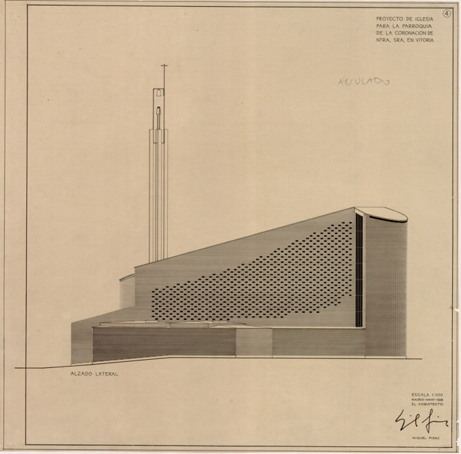 Miguel Fisac, junto con Alejandro de la Sota, recibió el encargo de diseñar este templo. Cada arquitecto realizó una propuesta y finalmente se decidieron por la de Fisac: un templo de trazas orgánicas y materiales tradicionales.