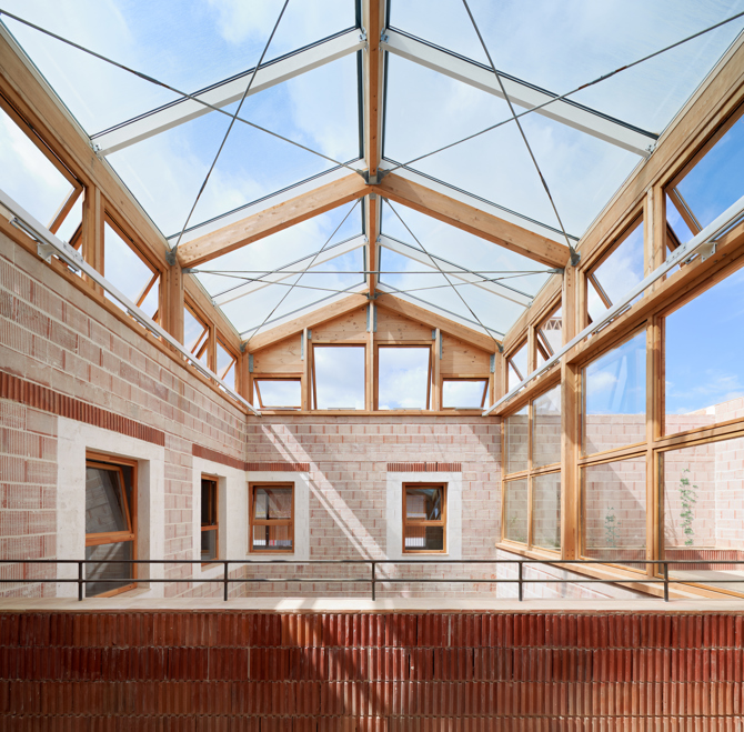En la zona del Coll d’en Rebassa, 11 VPP Rut 19, de Carles Enrich, da continuidad a la trama urbana con una volumetría coherente construida con bloque cerámico de fabricación local y forjados de madera. Su estructura modular permite una organización interior de los espacios sin jerarquías, mientras que la ventilación cruzada y los lucernarios garantizan el confort.