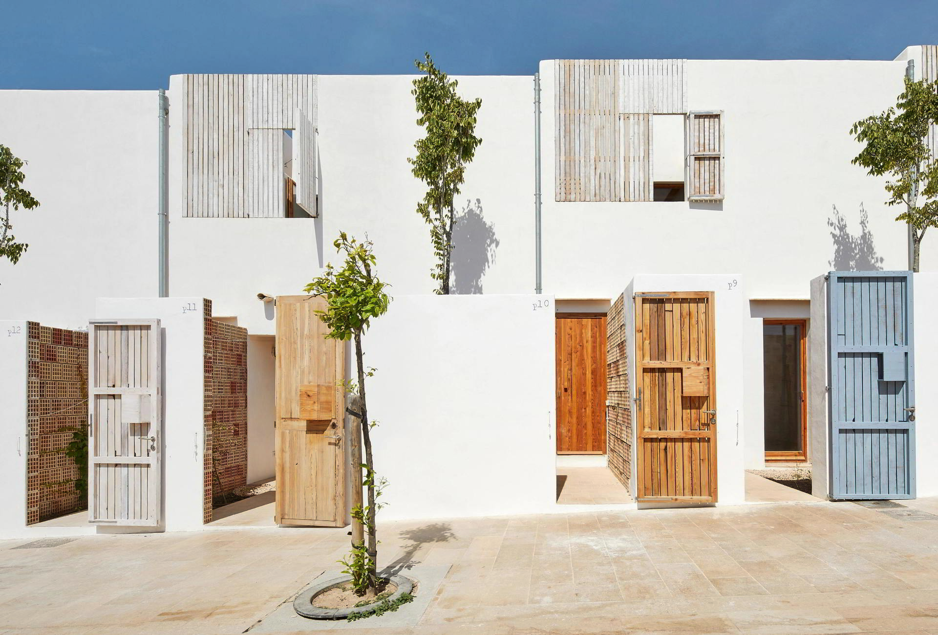 En Inca, las 9 VPP Marjades SN, de Esteve Torres, Estruch Martorell y Ripoll Tizón, combinan muros de ladrillo y pilares de marés con forjados prefabricados de madera. La fachada orientada al patio interior busca, mediante su diseño, maximizar el asoleamiento, mientras que las chimeneas captan los vientos dominantes. Las puertas correderas, ubicadas junto a los pilares exentos, permiten modular los espacios y su privacidad.