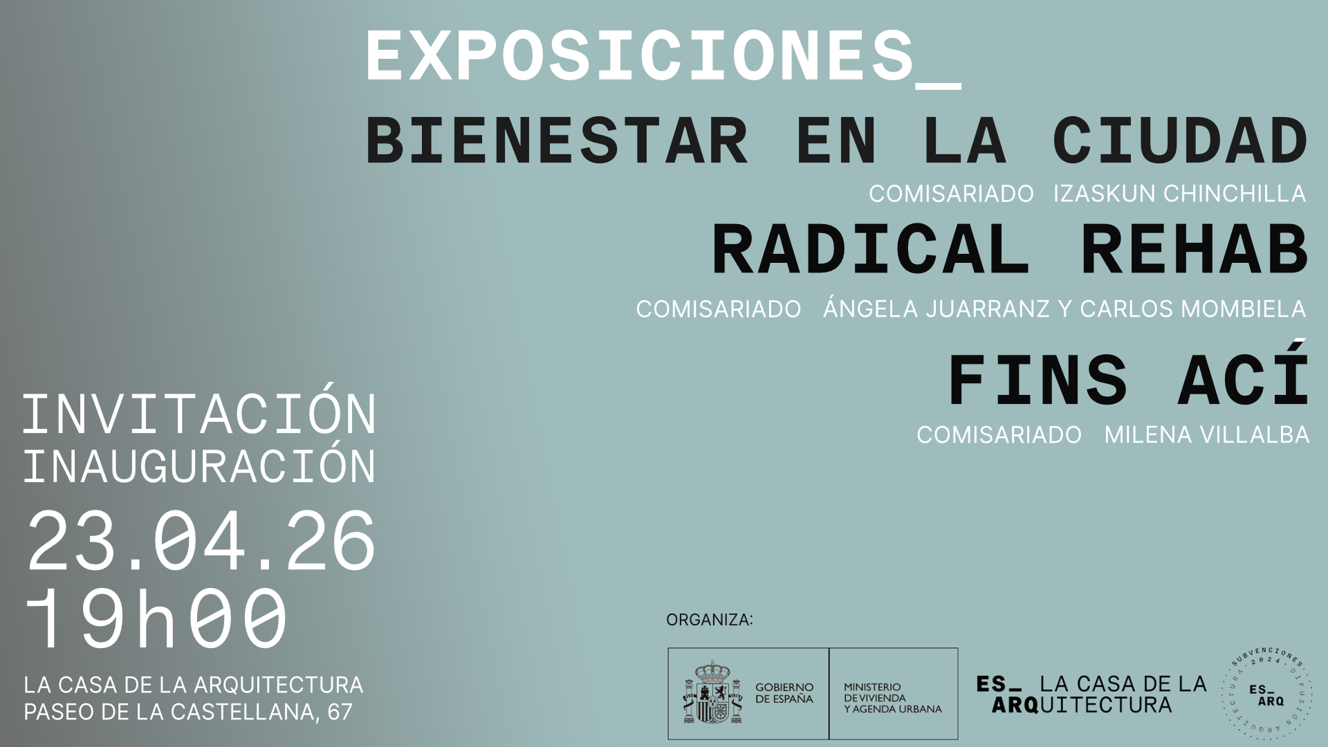 Desde la Casa de la Arquitectura ofrecemos la posibilidad de asistir a la inauguración de las nuevas exposiciones que presentaremos esta primavera en la Casa de la Arquitectura: el Bienestar en la Ciudad, comisariada por Izaskun Chinchilla, y Radical Rehab, comisariada por Ángela Juarranz y Carlos Mombiela. Será un placer compartir con el público visitante al museo este encuentro, que tendrá lugar el jueves 23 de abril de 2026 a las 18:30 horas en la Casa de la Arquitectura.(Paseo de la Castellana, 67 – Madrid). Dado el aforo limitado, agradecemos que confirméis asistencia tu asistencia antes del lunes 6 de octubre, registrándote en el siguiente enlace: [Inauguración de exposición– Casa de la Arquitectura | Eventbrite]
