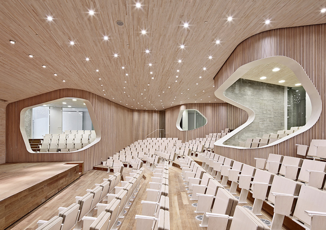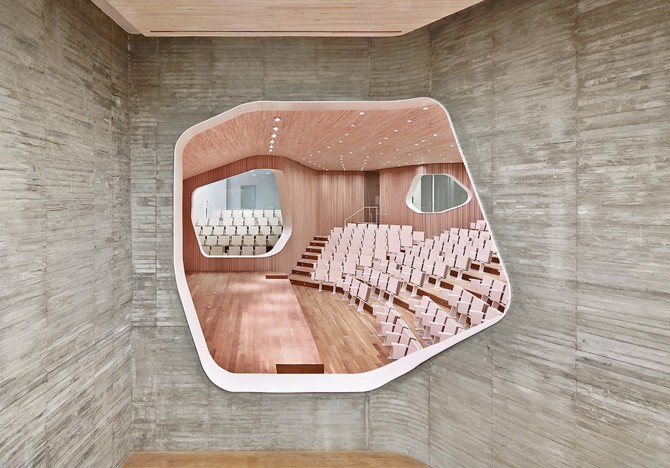 El edificio es esquivo, tan fragmentado que es imposible percibirlo como un todo, sino como pabellones, espacios y rincones ajustados a la escala de la Casa Giner y el Pabellón Macpherson, las dos piezas restauradas. Debajo, la proyección de las salas superiores genera un paisaje-sala para los eventos públicos compuesto por salas abiertas al escenario a través de grandes aberturas que parecen ojos estrábicos.