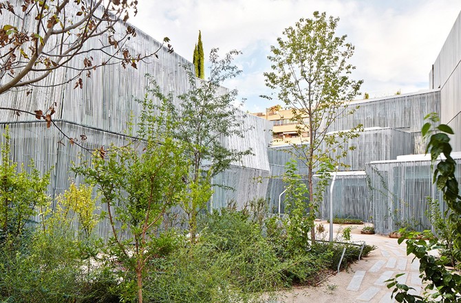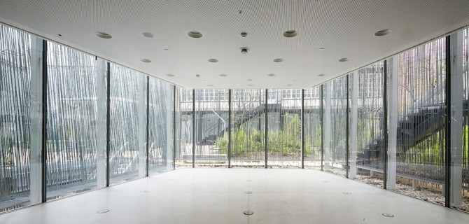 Las aulas, que recuerdan el ideal de “acercarse al máximo a la vida al aire libre”, son espacios multifocales sin una dirección predominante, rodeados de un recinto complejo formado por las cortinas, la estructura, el vidrio y una celosía metálica que forma un radical fondo abstracto para enfatizar el papel del jardín. En el lado de la calle, el sistema se transforma y se eleva para proporcionar una escala urbana adecuada, separándose del edificio existente y definiendo el nuevo acceso a la Fundación.