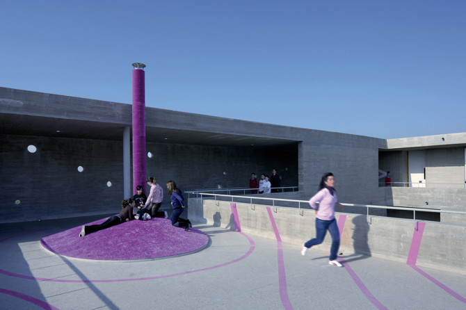 Sin embargo, éramos plenamente conscientes de que era imposible enfrentarse abiertamente al tsunami de la urbanización con una arquitectura fácil de usar y sin pretensiones. En cambio, el proyecto tendría que funcionar con mayor paciencia e intentar proyectarse hacia el futuro. Necesitábamos la participación activa de los despreocupados adolescentes que se deslizaban cada día por la rampa rosa hacia el patio del instituto. ¿Serían capaces de esperar algo mejor que el siniestro futuro de chalets adosados previsto para ellos? ¿Es realmente posible revertir esta situación?