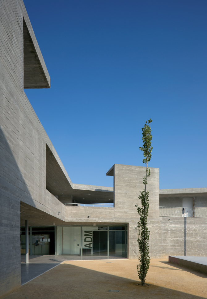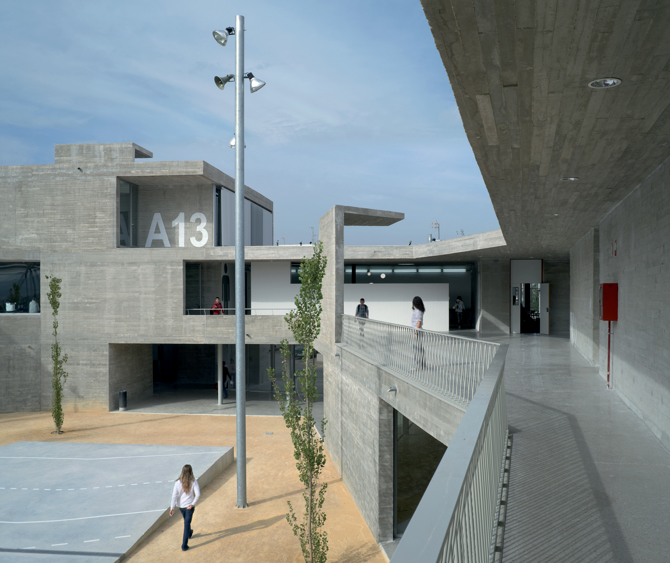 El resultado es que, al atravesar la envolvente perimetral, los alumnos se encuentran con un sorprendente espacio central donde un conjunto de siglas a diferentes alturas ayuda a entender el interior del instituto como un único patio multiforme que se extiende por las diferentes plantas, configurando una gran colección de espacios de relación a diferentes alturas. Un organigrama tridimensional construido en hormigón armado, donde cada aula o taller ocupa un volumen diferenciado, permite ver las siglas desde todo el patio.